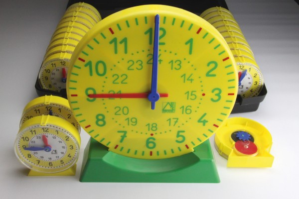 bestehend aus 1 großen Lernuhr (mit sichtbarem Zeigerwerk, ø 27 cm. 24 Stundenzahlen, farbig abgesetzt mit großem festmontiertem Standfuß.), 24 Schüleruhren (11 cm ø, 24 Stundenzifferblatt mit Klarsichtuhrdeckel) im Kunststoffkoffer