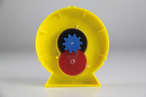 Bei dieser tausendfach bewährten Kunststoffuhr werden die abgedeckten Uhrzeiger mittels Uhrwerk synchron bewegt.
