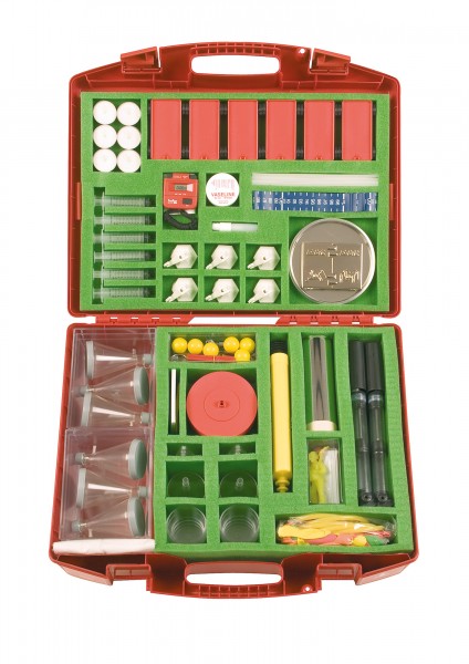 Wannen (transparent), Saugflaschen mit abnehmbarem Boden, Trichter, Becher, Platten, Schläuche (Kunststoffrohr), Schwimmkörper, Luftballons, Luftballonventile, Ballonpumpe, Rückstoßwagen mit Ventilgabel, Luftkissenplatte, Luftpumpen (Zylinder transparent), Blitzventile, Spritzen mit Schlauchansatz, Saughebelhaken, Lupen, Objektträger mit Gitterraster, Vaseline, Teelichte, Bandmaße, Scheren, Schnur, Klebeband, Stoppuhr, Fallschirme, Raketenmodell, Heißluftballon aus Spezialfolie, Esbitbrenner (vernickelt) mit Metallteller und Heizrohr, Esbit-Trockenbrennstoff, Zerstäuber, Lehrerheft, Lernen an Stationen ”Experimentieren mit Luft”.