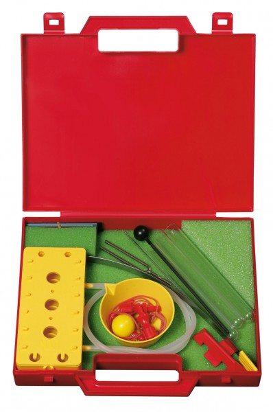 Die Box enthält eine ausführliche Anleitung und 14 verschiedene Artikel, die ein schnelles Aufbauen der Experimente ermöglichen, u.a. eine Schallbox, Stimmgabel, Reagenzgläser, Klangplatten, (Glockenspiel, gestimmt c, d, e, f, g), Schale, Saitenspanner, Hörschläuche, Federstahlstreifen, Ohroliven, Schlegel, Stahlnadel, Gummiringe, Dreikantsteg, Kugel am Faden und Versuchsanleitung. Material für 1 Schülergruppe