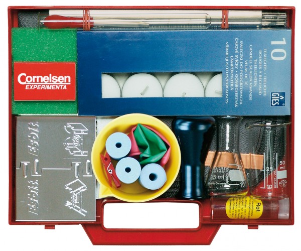 Brennergestell, Teelichte, Drahtnetz, Thermometer, Arbeitsschale, Erlenmeyerkolben - hitzebeständig, Erlenmeyerkolben - hitzebeständig - schwarz, Becherglas - hitzebeständig, Bimetallstreifen Rohre: Glas und Aluminium, Kapillarrohre, Reagenzglas, Luftballons, Silikonschlauch, Färbemittel, Gummistopfen mit Bohrung, Schlauchkupplung, Klammern, Pipette - Kunststoff, Metallfolien, Feuerfeste Unterlage, Versuchsanleitung.