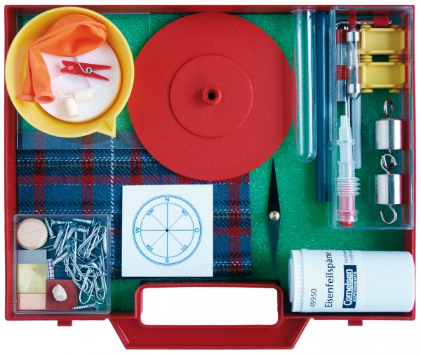 Streuer mit Eisenpulver, Kunstglasscheibe, Windrosenplatte, Kunststoffstab mit Bohrung, Nadelhalter, Luftkissenplatte mit Bohrung, Schale, Schwimmkörper, Reiblappen - Wolle, Hakengewichte, Magnetnadel, Klammern, Luftballons, Glimmlampe, Holundermark-Doppelpendel, Klemmbuchsen, kleine Stabmagnete mit Polkennzeichnung, Metallachse, Rollwagen, Reagenzgläser (Kunststoff), Ballonventil, Haltebügel, Satz Kleinmaterial, Versuchsanleitung.